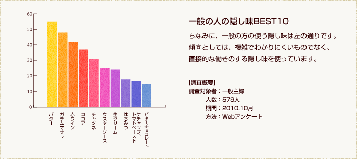 プロが用いる隠し味は複雑多岐にわたります。 では、プロでない一般の人が家庭でどのように使いこなしたらいいのでしょうか? そこでプロの方々に一般の方々でも簡単に使いこなせプロの味に近づく優れた隠し味を選んでもらいました。 1位のオイスターソースは旨みや甘み、コクなど、料理をおいしくする要素が全て入っています。かといって主張しすぎず、一晩寝かせるとさらに味が出ます。日本人は旨みと甘みを強調するとおいしく感じる特性があります。 2位はココア。大人の好む上質な苦味が醸し出されます。カレーの奥底に入り込んで、苦味や香り、旨みやコクなどを増してくれる縁の下の力持ち的な働きもします。また、プロは下ごしらえの肉にまぶし、臭みを消すのと同時に上品な香り付けにも使用します。 3位は生クリーム。牛乳やバターなど乳製品を入れる人は多いですが、少量で味を濃厚にしてくれるパンチ力があります。 4位の炒め玉ねぎは奥深い甘みを演出してくれます。1時間くらいかけて飴色に炒めるのはけっこう大変な作業なので、冷凍で作り置きしておくことをお薦めします。最近では市販品も発売されています。 5位の豆板醤は辛味です。ただ辛味がつくだけの唐辛子や粉っぽくなりがちなチリペッパーと違って、使いやすく深い辛味が期待できます。同時に、そら豆を発酵させて作ったものですので、コクも出ます。